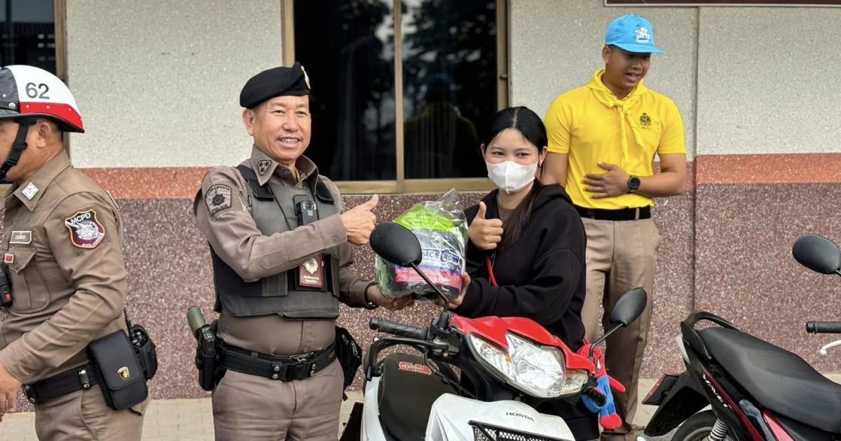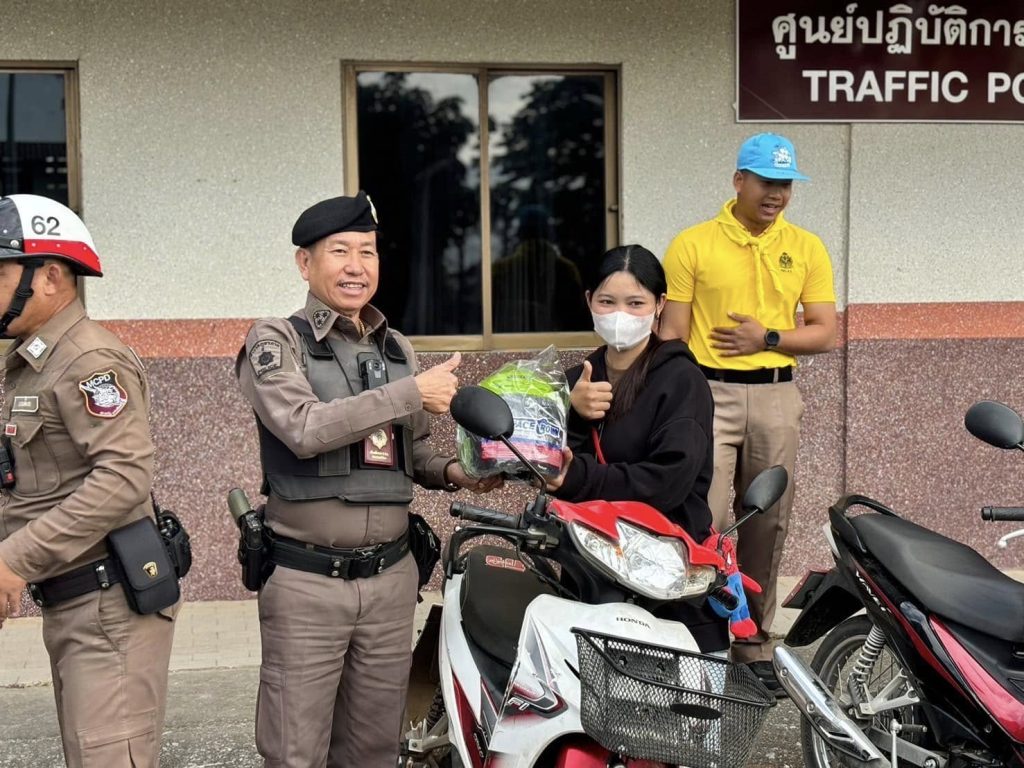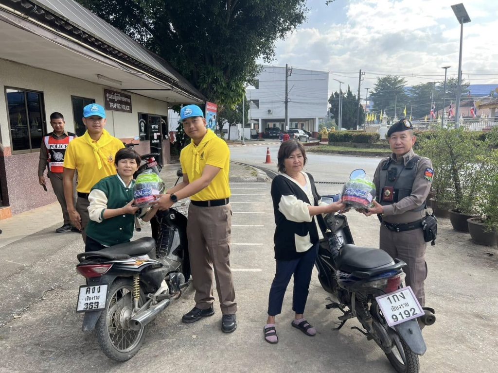 และเตือนพร้อมแจกหมวกกันน็อคนิรภัยให้แก่ประชาชนที่ขับขี่จักรยานยนต์ และไม่ได้สวมหมวกทั้งคนขี่-คนซ้อน