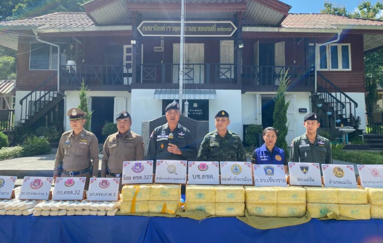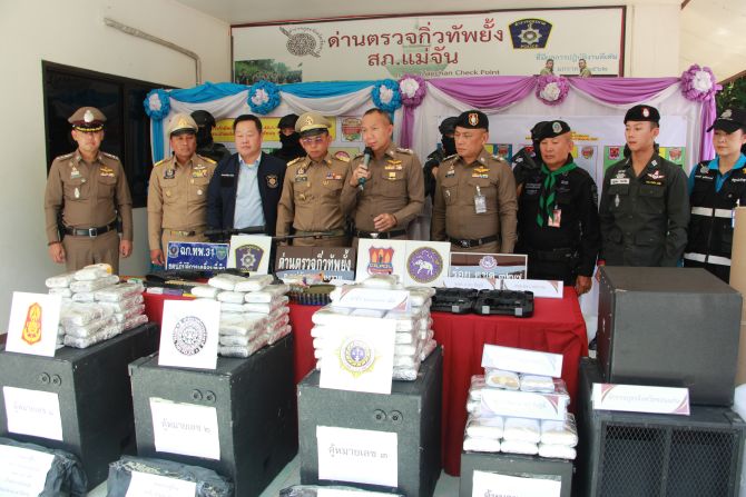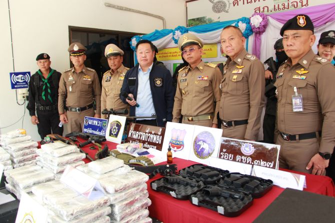 เวลา 13.00 น.วันที่ 23 ตุลาคม 2567 ที่ด่านตรวจกิ่วทัพยั้ง อ.แม่จัน จ.เชียงราย พล.ต.ท.กฤตธาผล ยี่สาคร ผู้บัญชาการตำรวจภูธรภาค 5 พล.ต.ต.มานพ เสนากูล ผู้บังคับการตำรวจภูธรจังหวัดเชียงราย พ.ต.อ.เกียรติศักดิ์ จิตรประสาร ผกก.สภ.แม่จัน นายโชตินรินทร์ เกิดสม รองปลัดกระทรวงมหาดไทย ไปรักษาการผู้ว่าราชการ จ.เชียงราย นายอภิกิต ฉ.โรจน์ประเสริฐ รองเลขาธิการ ป.ป.ส. ทหารกองกำลังผาเมือง และ ร้อย ตชด.327 ได้ร่วมกันแถลงข่าวการตรวจยึดของกลางยาเสพติดประเภทยาบ้าจำนวน 600,000 เม็ด รถยนต์กระบะ 1 คัน รถจักรยานยนต์ 1 คัน อาวุธปืน 5 กระบอกพร้อมเครื่องกระสุนอีกเป็นจำนวนมาก