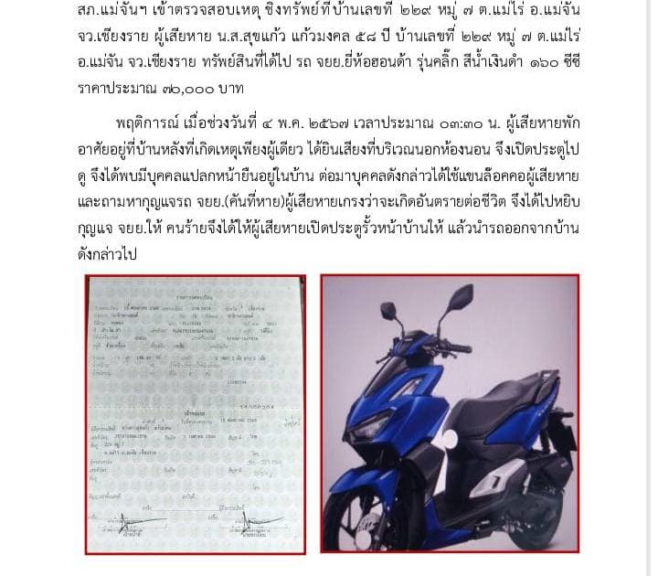 พฤติการณ์แห่งคดี ขณะผู้เสียหายนอนอยู่ในห้องนอนในบ้าน มีชายคนร้ายไม่ทราบเป็นใคร ตัดตะแกรงเหล็กห้องครัวบุกรุกเข้ามาในบ้านของผู้เสียหาย ๆ ได้ยินเสียงสุนัขในบ้านเห่า จึงเปิดประตูห้องนอนออกไปดู พบชายคนร้ายอยู่ในห้องครัวภายในบ้าน แต่งกายปิดบังใบหน้าสวมแว่นตากันแดดสีดำ สวมหมวกแก๊ป สวมเสื้อแขนยาว กางเกงขายาวสีเทา สวมถุงมือยาง ชายคนร้ายได้ใช้แขนซ้ายล๊อคคอผู้เสียหายเอาไว้ และใช้วัตถุของแข็งไม่ทราบว่า เป็นอะไรจี้ที่สีข้างด้านขวา ขู่บังคับให้มอบ กุญแจรถจักรยานยนต์ ได้รถจักรยานยนต์ รุ่นคลิ๊ก สีน้ำเงิน – ดำ ทะเบียน 2 กฆ 8039 ของผู้เสียหายที่จอดไว้ที่โรงจอดรถข้างบ้าน หลบหนีไป ได้มาร้องทุกข์ต่อพนักงานสอบสวน ให้สืบสวนติดตามหาคนร้ายมาดำเนินการตามกฎหมาย ต่อมาในวันที่ 5 พ.ค. 2567 ในช่วงเย็นเจ้าหน้าที่ชุดสืบสวน สภ.แม่จันและ สภ.เมืองเชียงราย ได้ติดตามพบว่ารถจักรยานยนต์คันที่ถูกชิงทรัพย์มานั้น ถูกจอดทิ้ง ไว้ที่ลานจอดรถจักรยานยนต์ของ โรงพยาบาลเชียงรายประชานุเคราะห์ จึงได้จัดกำลังเฝ้าสังเกตการณ์ จนกระทั่ง เวลาประมาณ 21.30 น.ของวันเดียวกัน ผู้ต้องหาได้เดินเข้ามาลานจอดรถ และจะขับขี่รถจักยานยนต์คันดังกล่าวออกไป เจ้าหน้าที่ตำรวจชุดจับกุมจึงได้แสดงตัว จับกุมเบื้องต้นผู้ถูกจักกุมได้รับสารภาพว่าเป็นผู้ก่อเหตุจริง โดยประสงค์ที่จะเข้าไปลักเอารถจักรยานยนต์ดันดังกล่าวในคืนที่เกิดเหตุแต่ ผู้เสียหายตื่นมาพบเสียก่อน จึงกลายเป็นบีบบังคับให้ส่งมอบกุญแจรถจักรยานยนต์ให้ แล้วหลบหนีไปส่วนรายละเอียดอื่นๆ อยู่ระหว่างสอบสวนขยายผลเพิ่มเติม