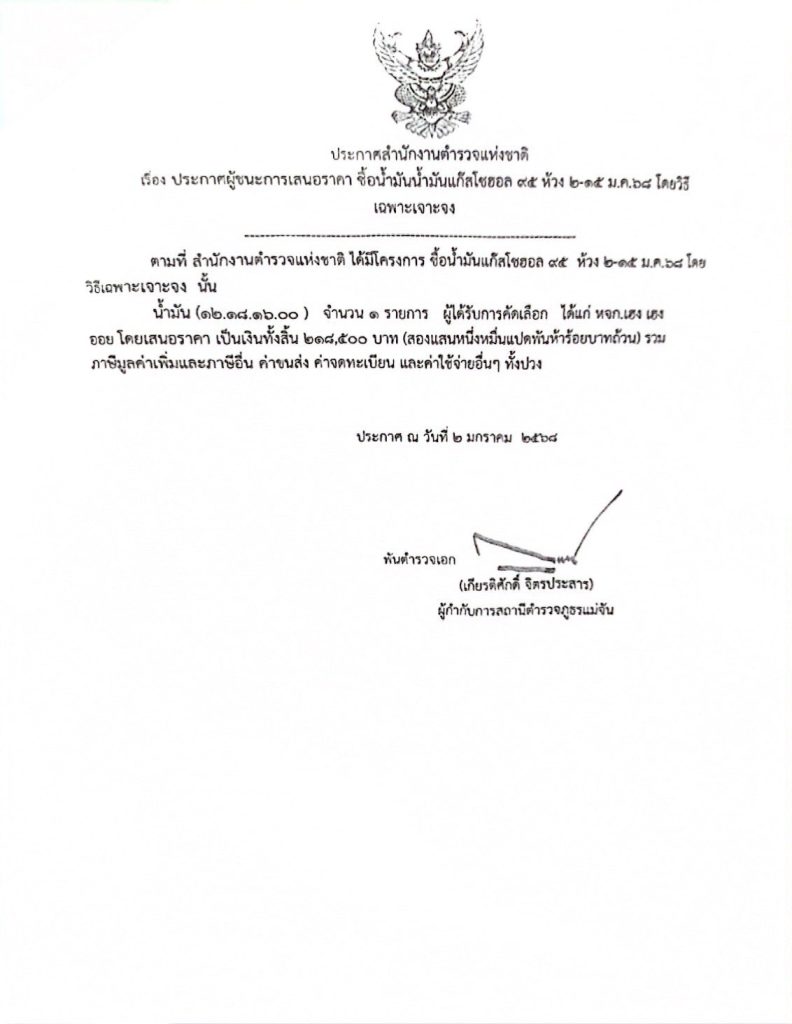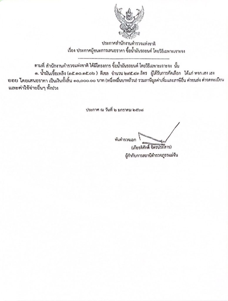 ประกาศผู้ชนะเสนอราคาซื้อน้ำมัน