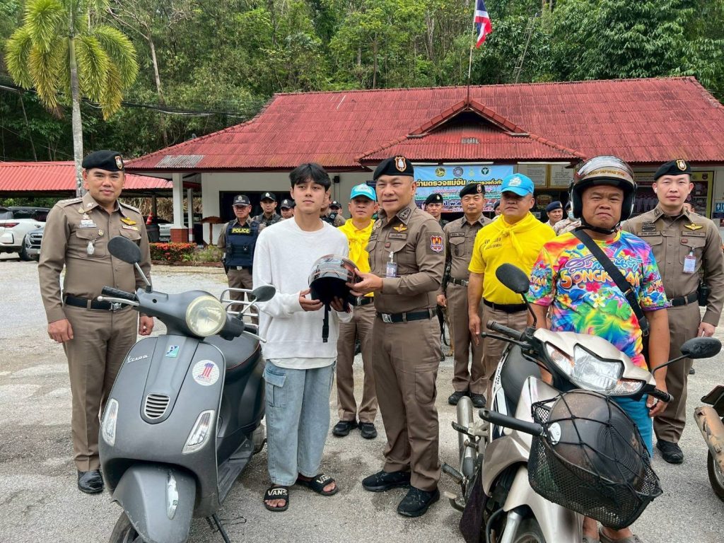 พร้อมทั้งแจกหมวกนิรภัยเพื่อเสริมสร้างวินัยจราจรให้แก่ประชาชน ตามโครงการจิตอาสาจราจร เพื่อลดอุบัติเหตุช่วงเทศกาลสงกรานต์ แก่ผู้ขับขี่จักรยานยนต์ที่ไม่มีหมวกนิรภัย จำนวน 3 คน