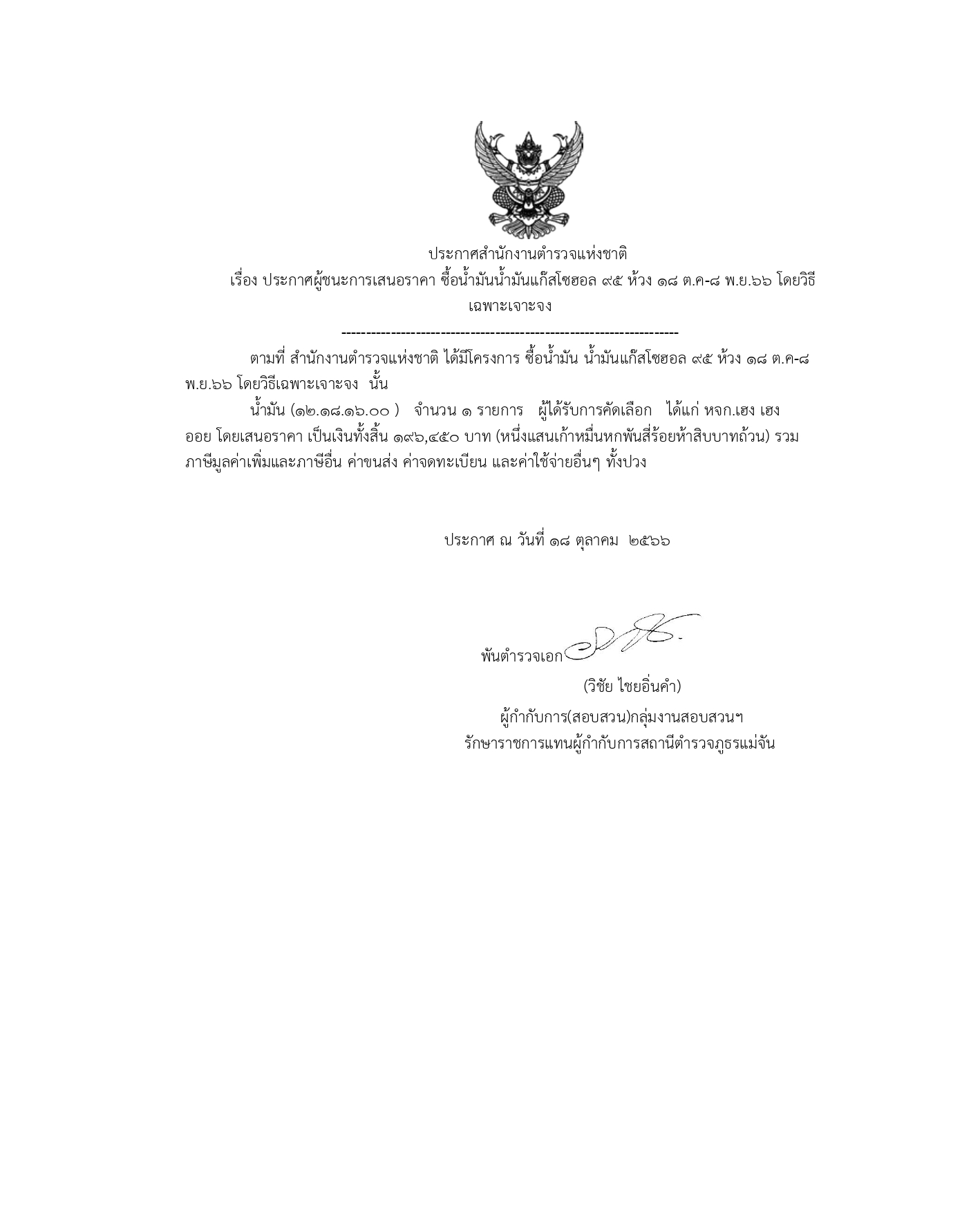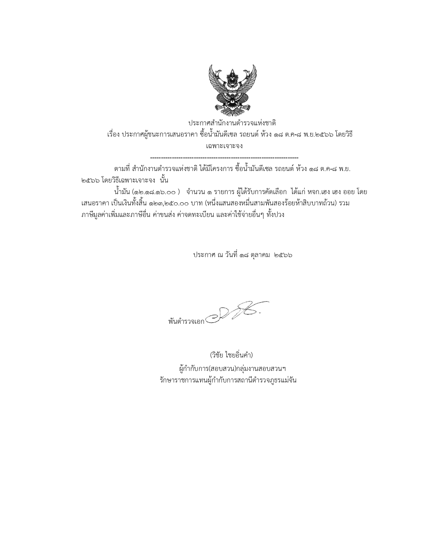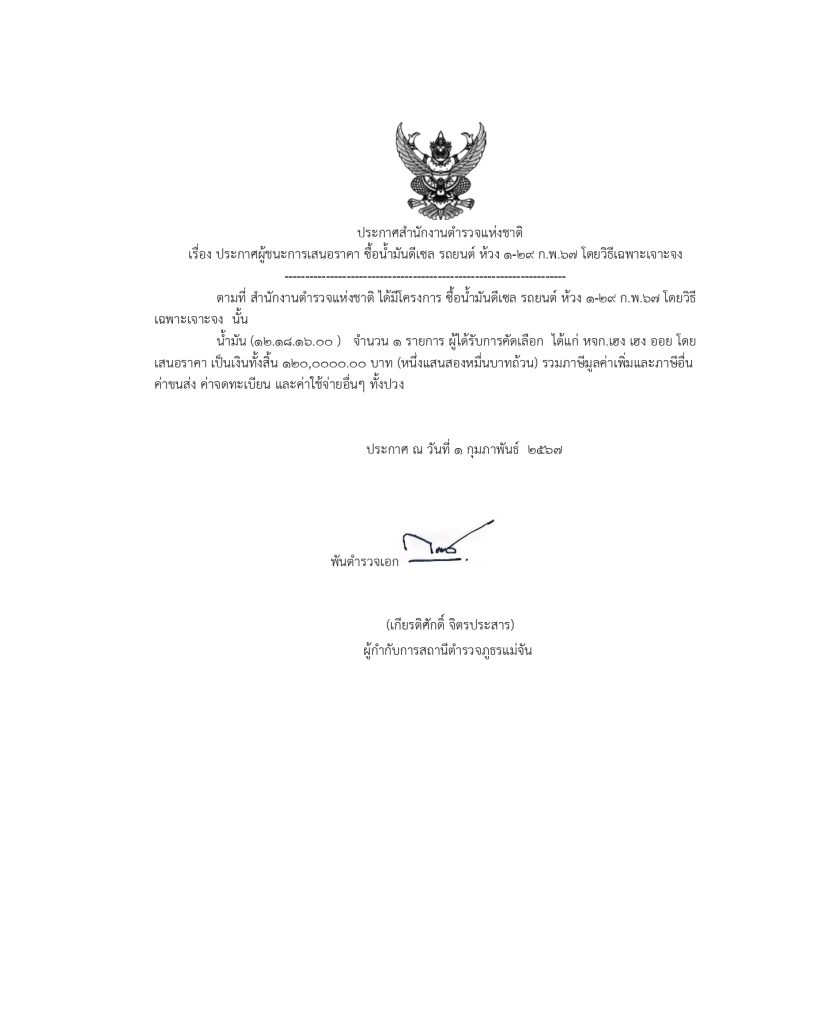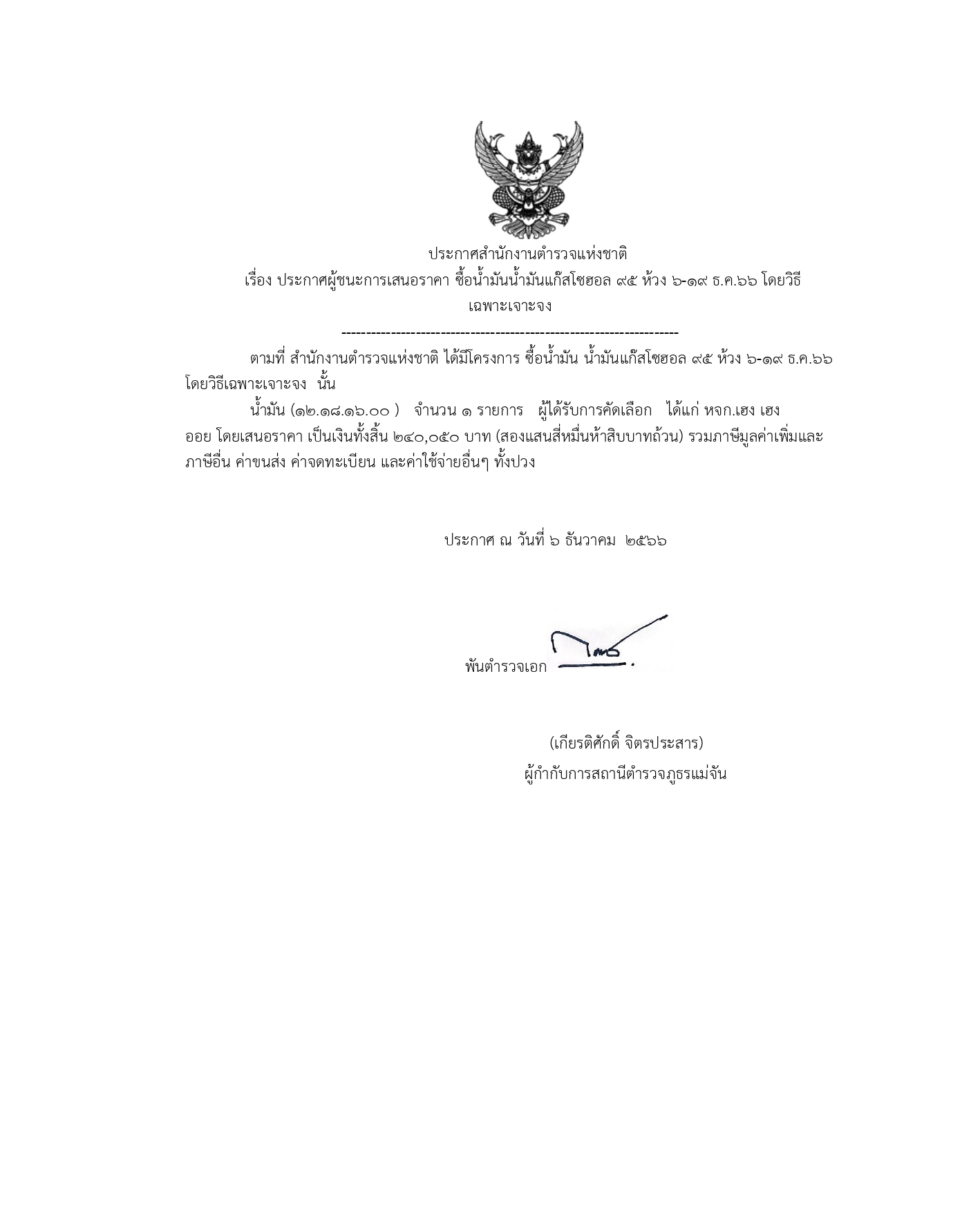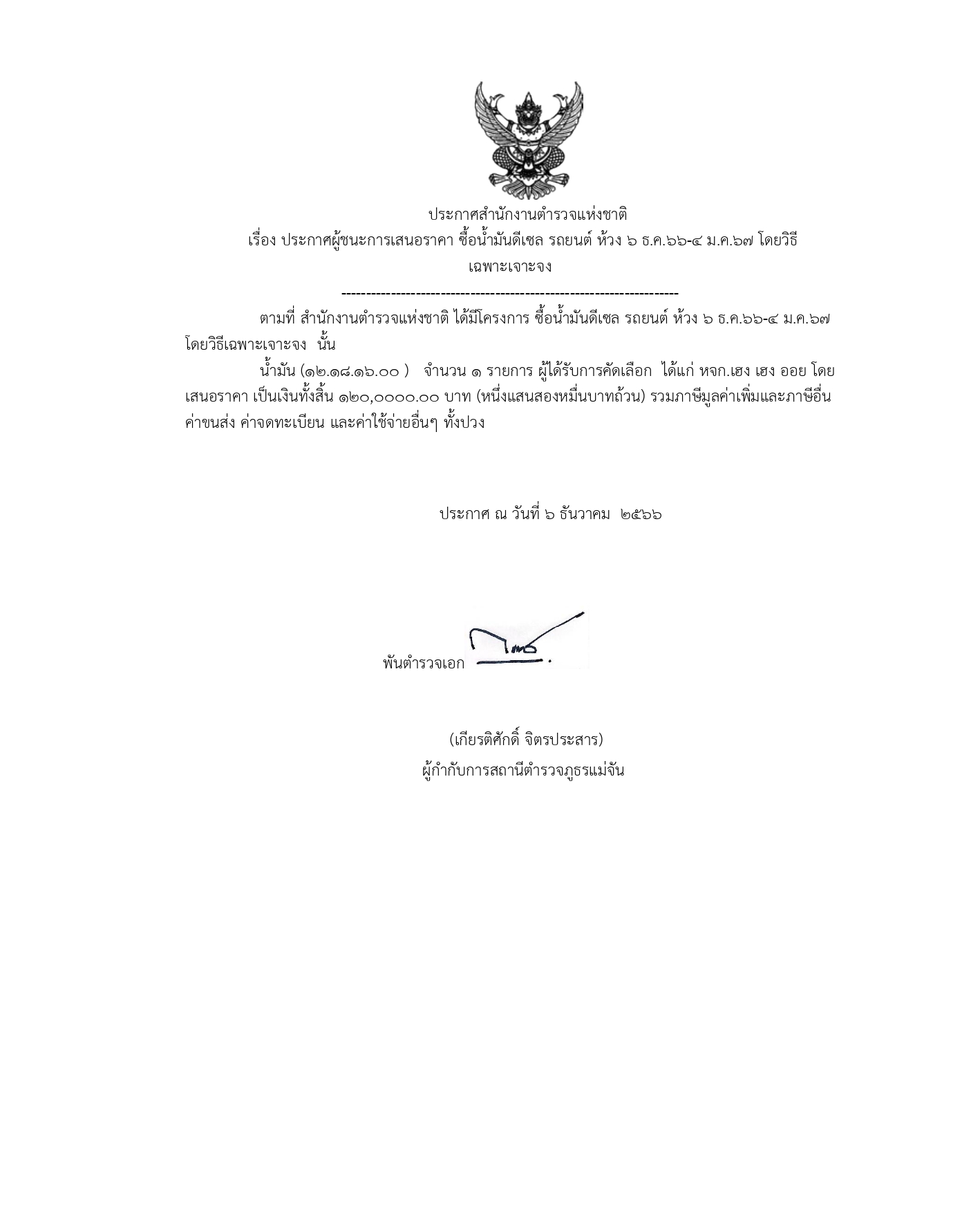 ประกาศผู้ชนะเสนอราคา จัดซื้อน้ำมันเชื้อเพลิงชุดปฏิบัติการสืบสวนปราบปรามกลุ่มการค้าและอิทธิพล ตามแผนปฏิบัติการแก้ไขปัญหายาเสพติดชายแดนภาคเหนือแบบเบ็ดเสร็จ