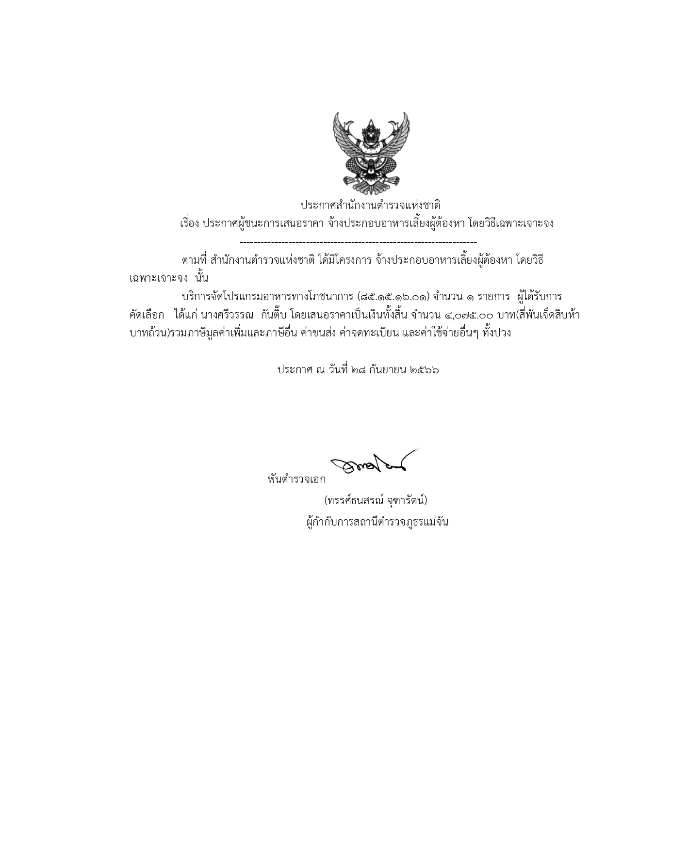 ประกาศผู้ชนะการเสนอราคาสำหรับการจ้างเหมาประกอบอาหารสำหรับผู้ต้องหา