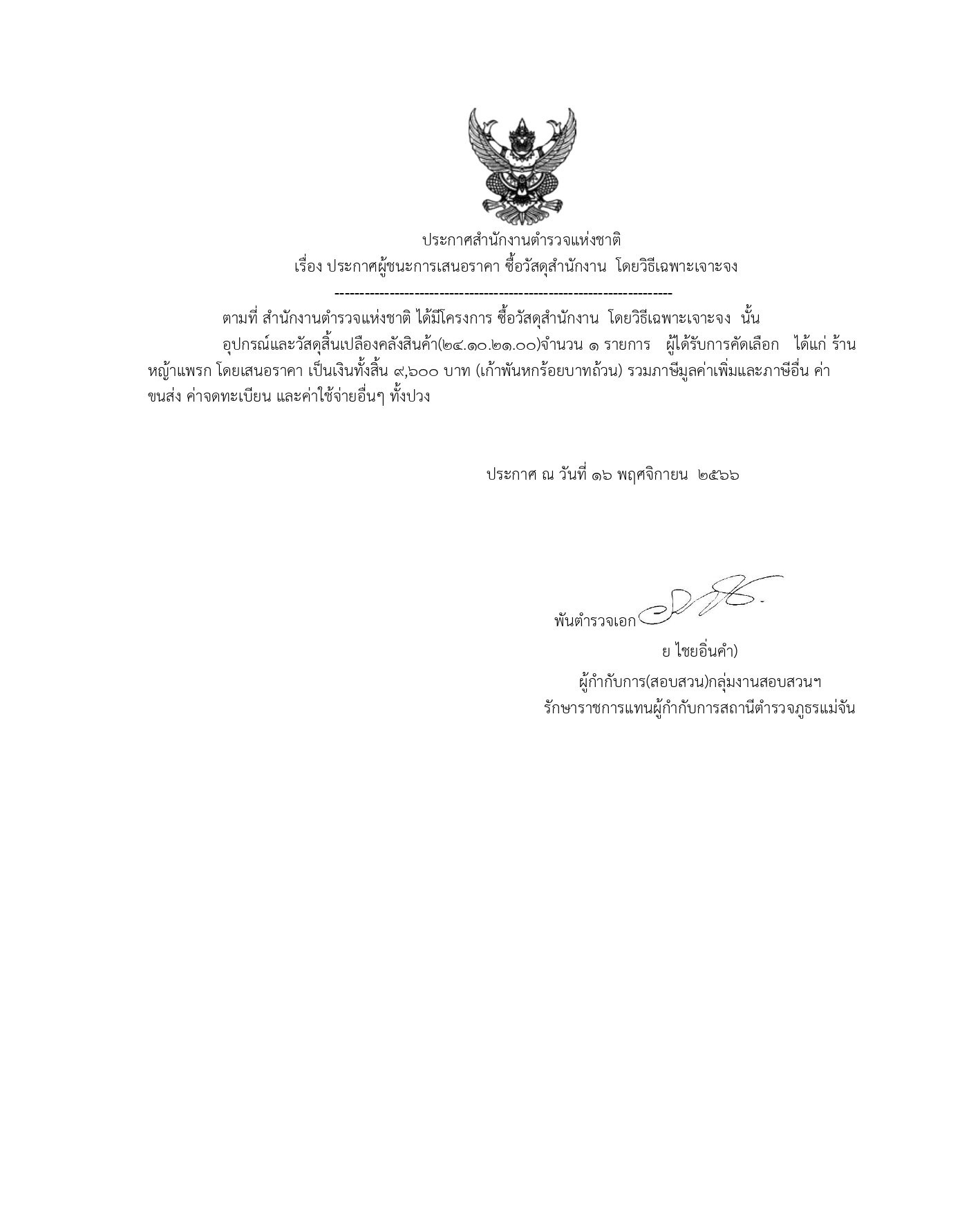 ประกาศผู้ชนะการเสนอราคาสำหรับงานจ้างเหมาประกอบอาหาร สำหรับผู้ต้องหา