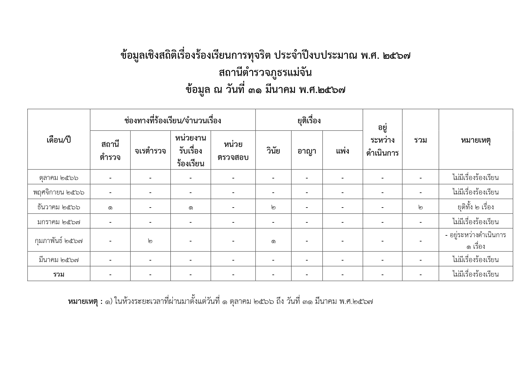 ข้อมูลสถิติเรื่องร้องเรียนการทุจริตและประพฤติมิชอบของเจ้าหน้าที่ในสถานีตำรวจภูธรแม่จัน แยกเป็นรายเดือน
