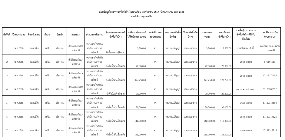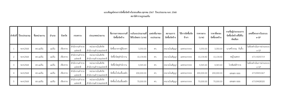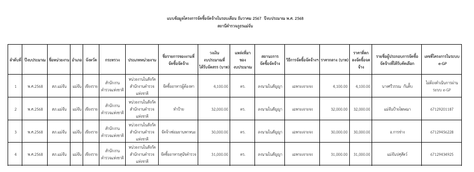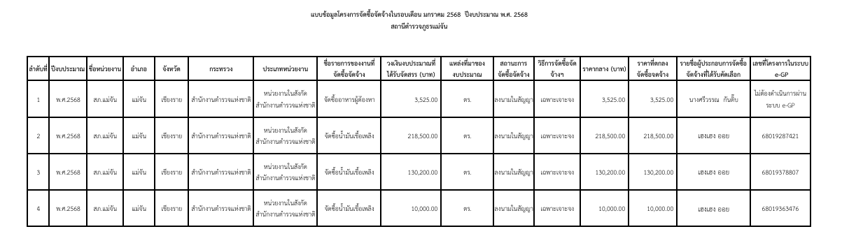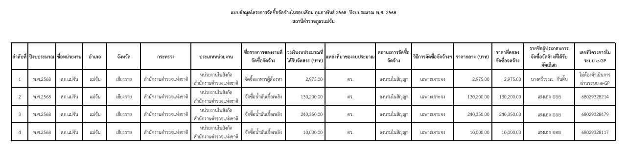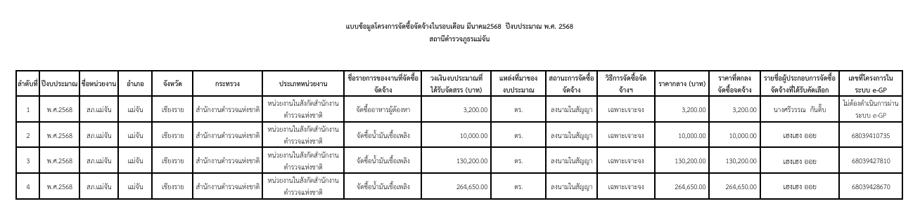 สรุปผลการจัดซื้อจัดจ้างรายเดือน สถานีตำรวจภูธรแม่จัน ได้สรุปผลการดำเนินการจัดซื้อจัดจ้าง (สขร.1) ประจำเดือน โดยมีข้อมูลรายละเอียดผลการจัดซื้อจัดจ้าง ได้แก่ งานที่ซื้อหรือจ้างวงเงินที่ซื้อหรือจ้าง ราคากลาง วิธีการซื้อหรือจ้าง รายชื่อผู้เสนอราคาและราคาที่เสนอ ผู้ได้รับกำรคัดเลือกและราคาที่ตกลง เหตุผลที่คัดเลือกโดยสรุป เลขที่และวันที่ของสัญญำ หรือข้อตกลงในกำรซื้อหรือจ้าง โดยจำแนกข้อมูลเป็นรายเดือน เผยแพร่เป็นประจำทุกเดือน ช่วง 6 เดือนแรกของปีงบประมาณ พ.ศ. 2568 มีรายละเอียดดังปรากฏด้านล่างนี้